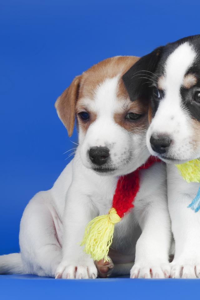 Wallpaper Two little cute puppies on blue background