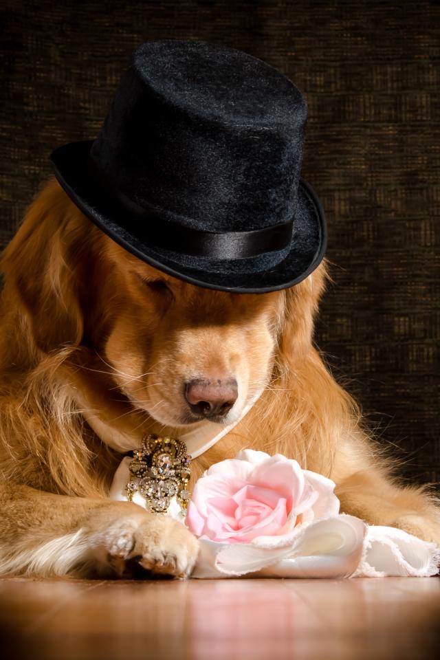 Wallpaper Golden Retriever in a black hat with a pink rose