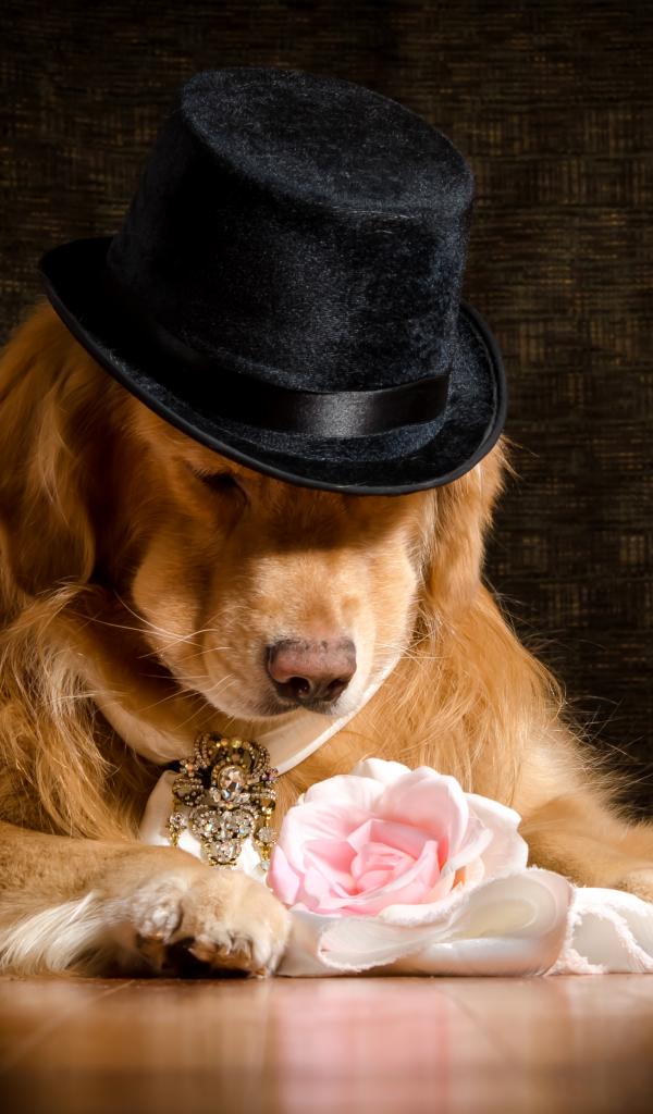 Wallpaper Golden Retriever in a black hat with a pink rose