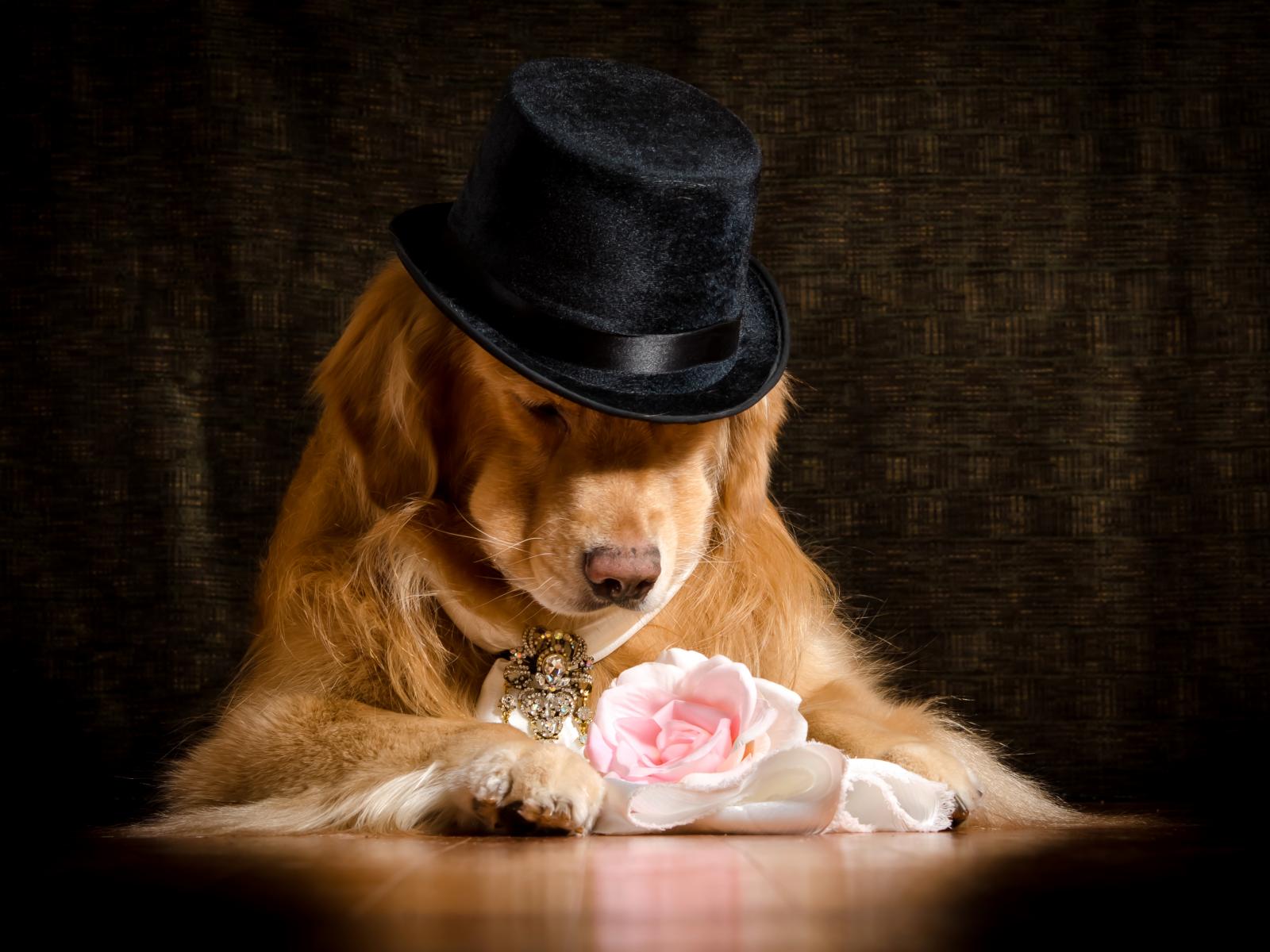 Wallpaper Golden Retriever in a black hat with a pink rose