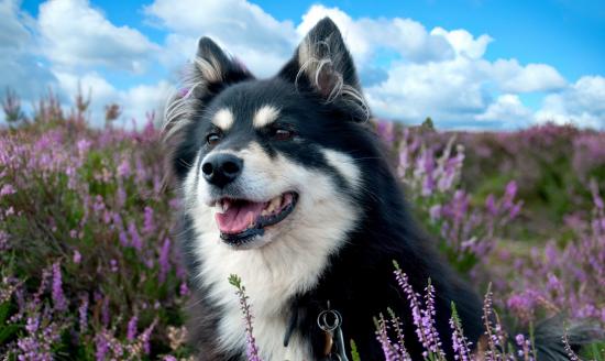 Wallpaper Beautiful purebred dog sits in lilac flowers