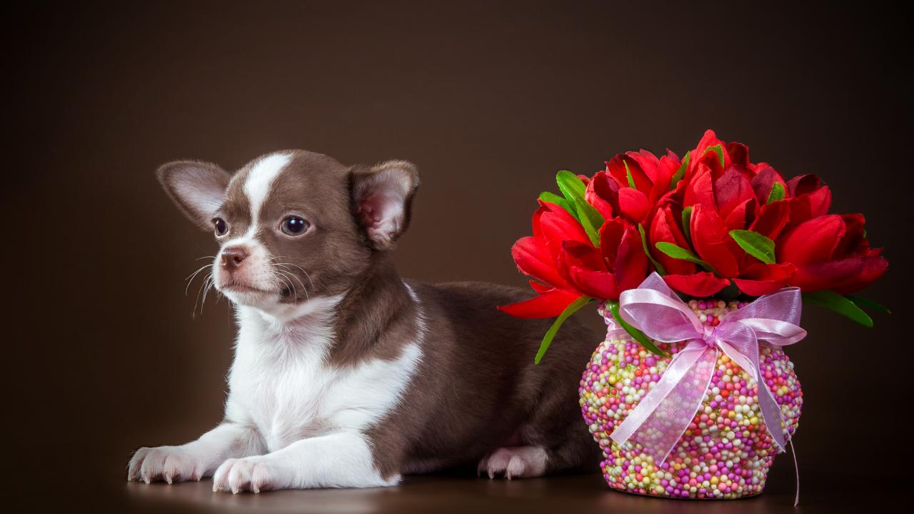 Wallpaper Little chihuahua with a bouquet on a brown background