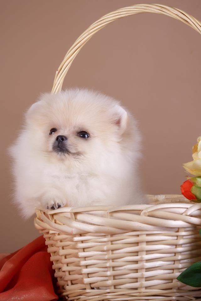 Wallpaper Little spitz sits in a basket with flowers
