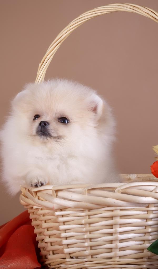 Wallpaper Little spitz sits in a basket with flowers