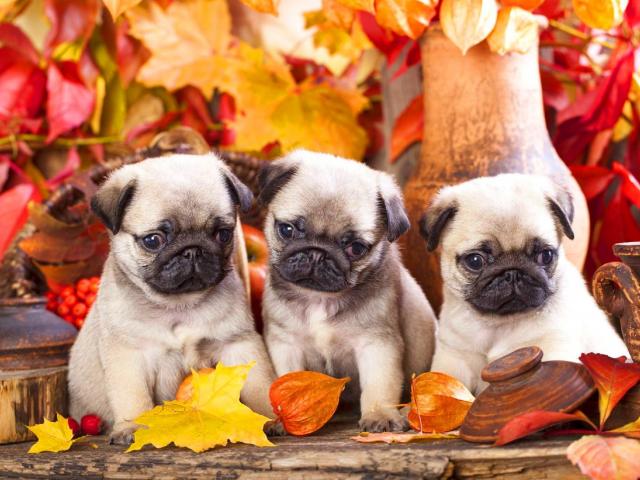 Wallpaper Three little pugs sit on the background of autumn leaves
