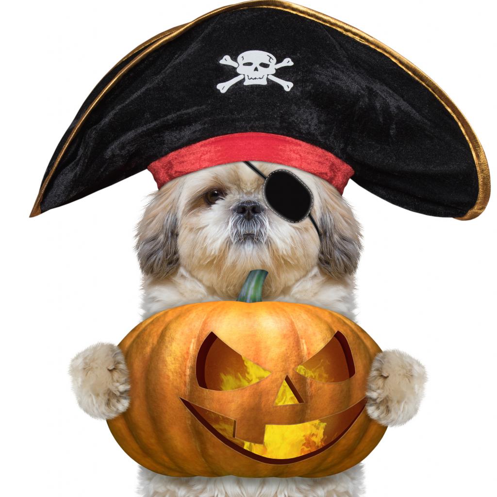 Wallpaper Dog in a pirate costume with a pumpkin on Halloween