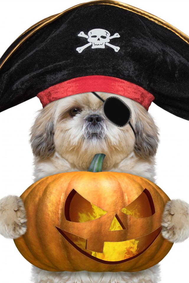 Wallpaper Dog in a pirate costume with a pumpkin on Halloween