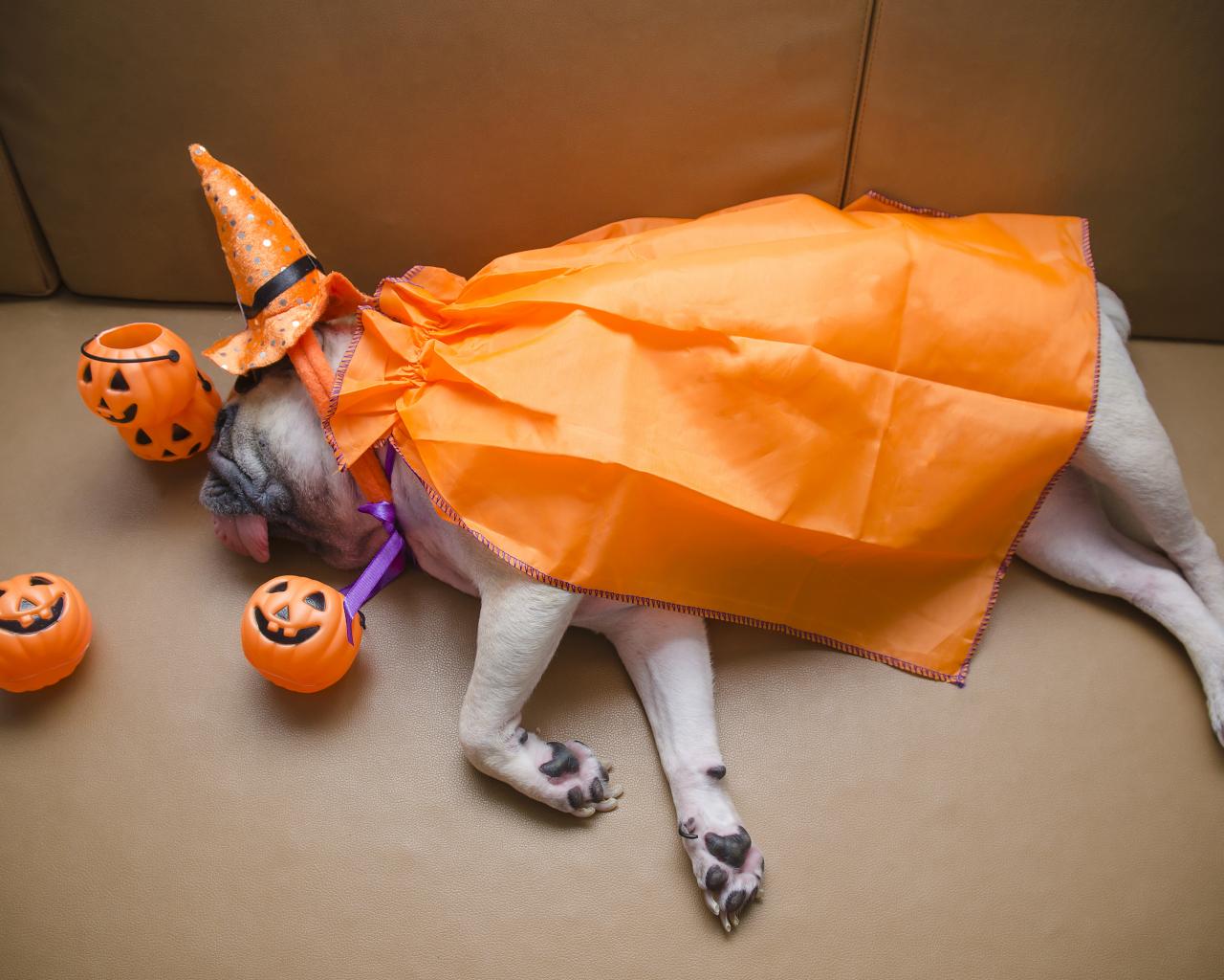 Wallpaper Pug in a suit sleeping on the couch with pumpkins