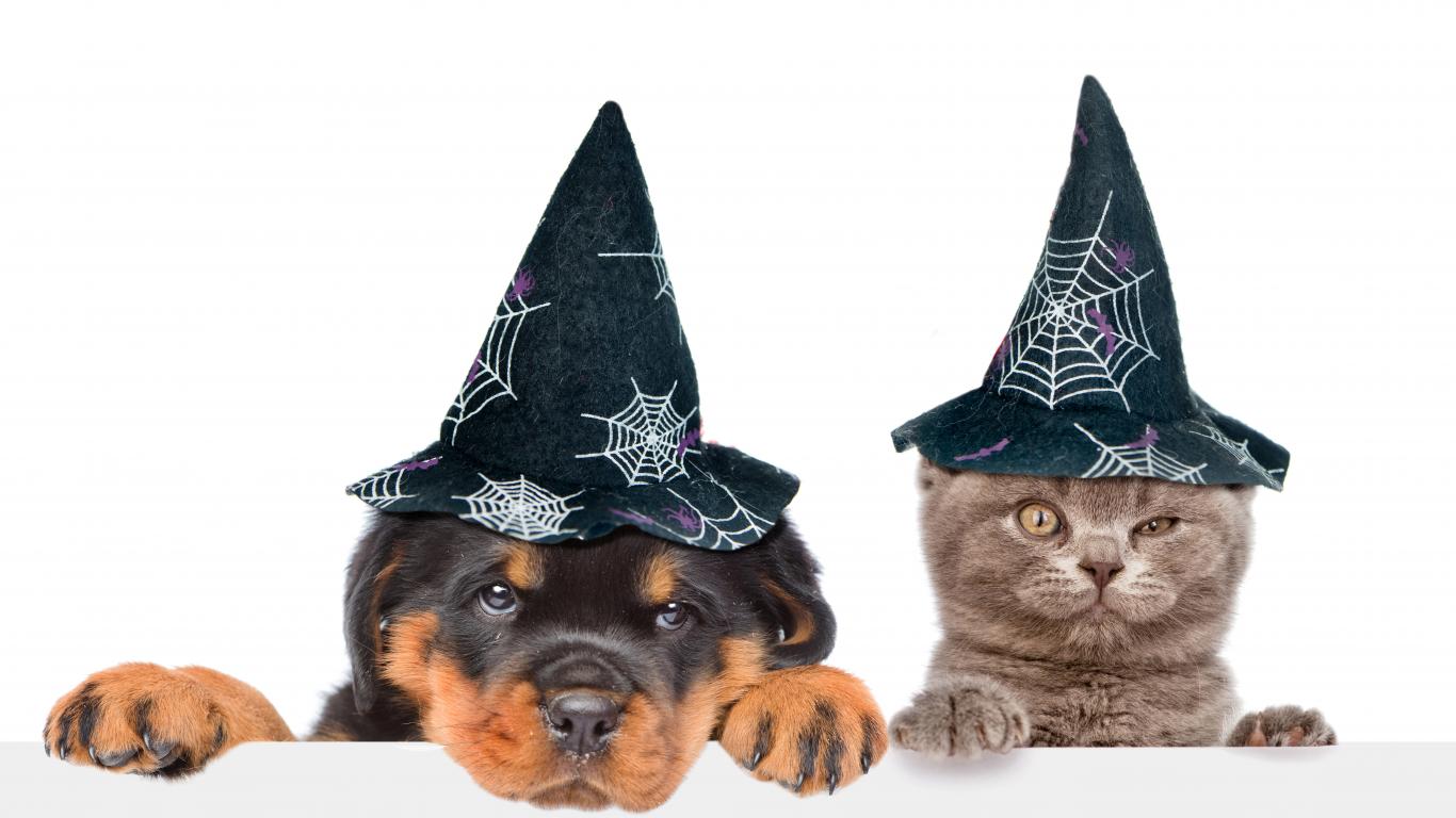 Wallpaper Puppy and kitten in halloween caps