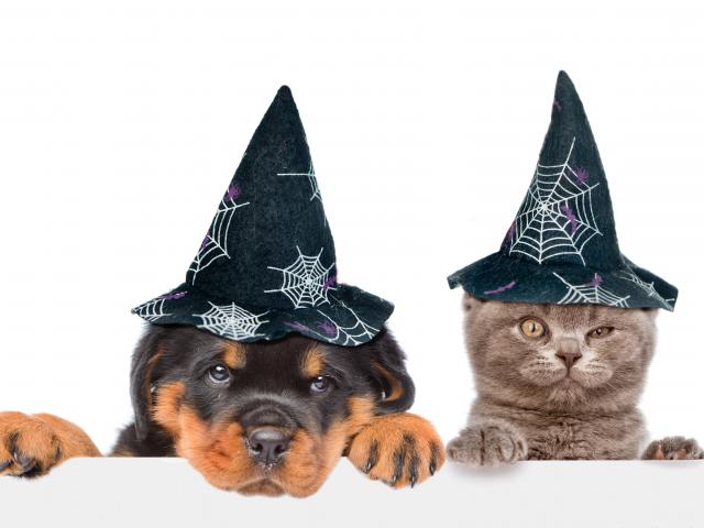 Wallpaper Puppy and kitten in halloween caps