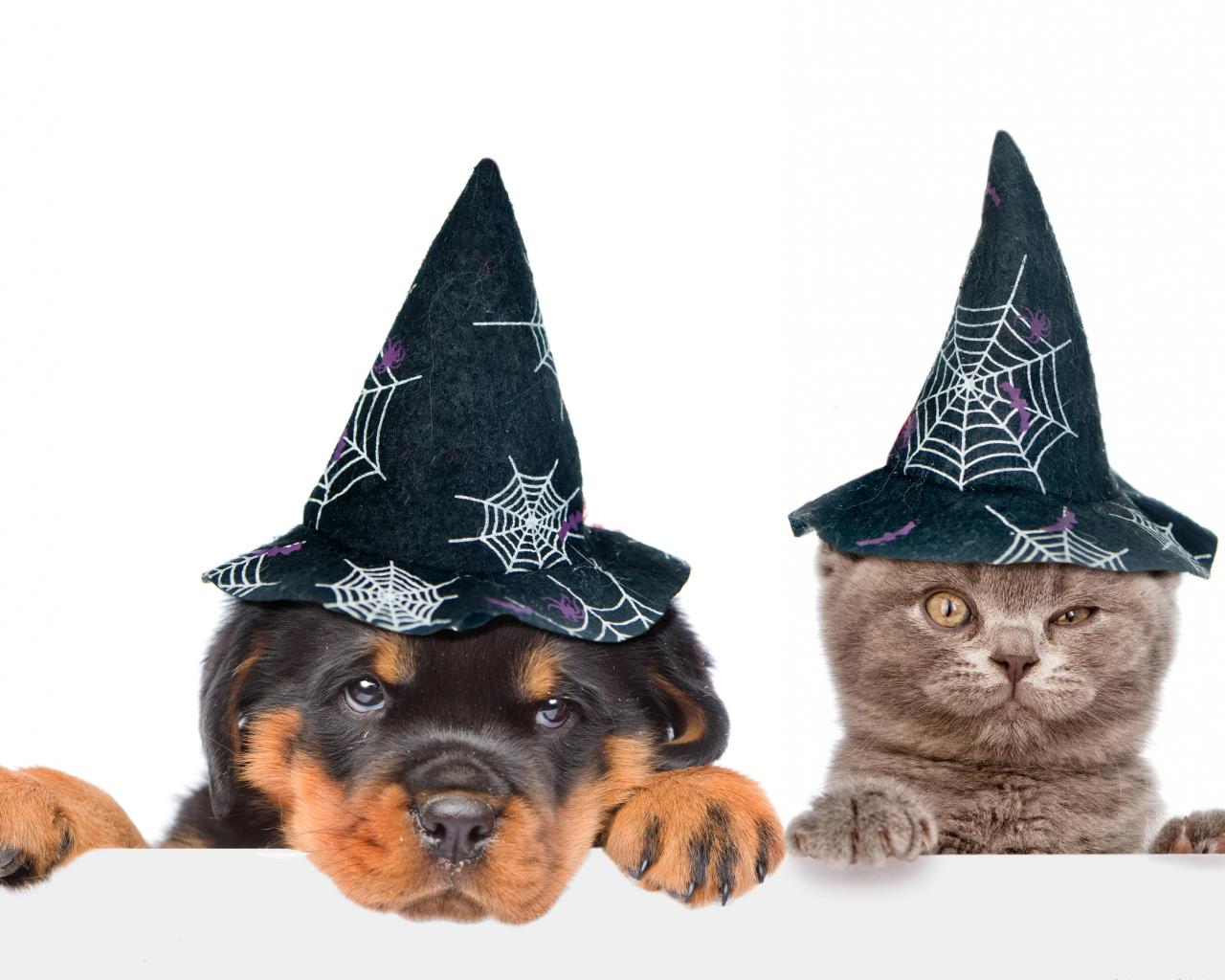 Wallpaper Puppy and kitten in halloween caps