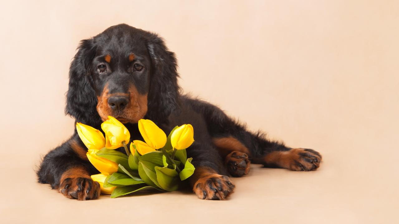 Wallpaper Sad dog with a bouquet of yellow tulips