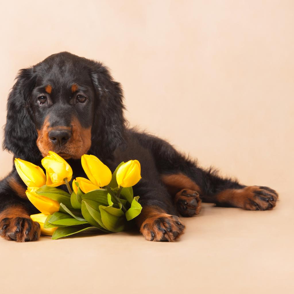 Wallpaper Sad dog with a bouquet of yellow tulips