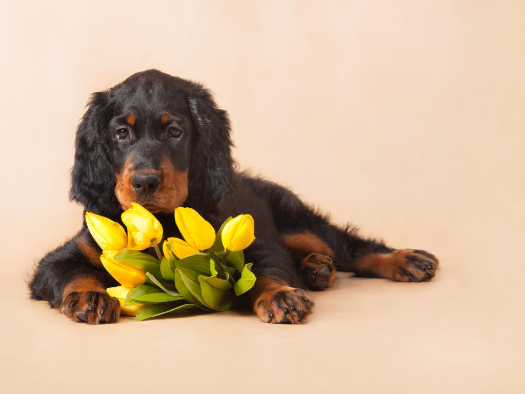 Wallpaper Sad dog with a bouquet of yellow tulips