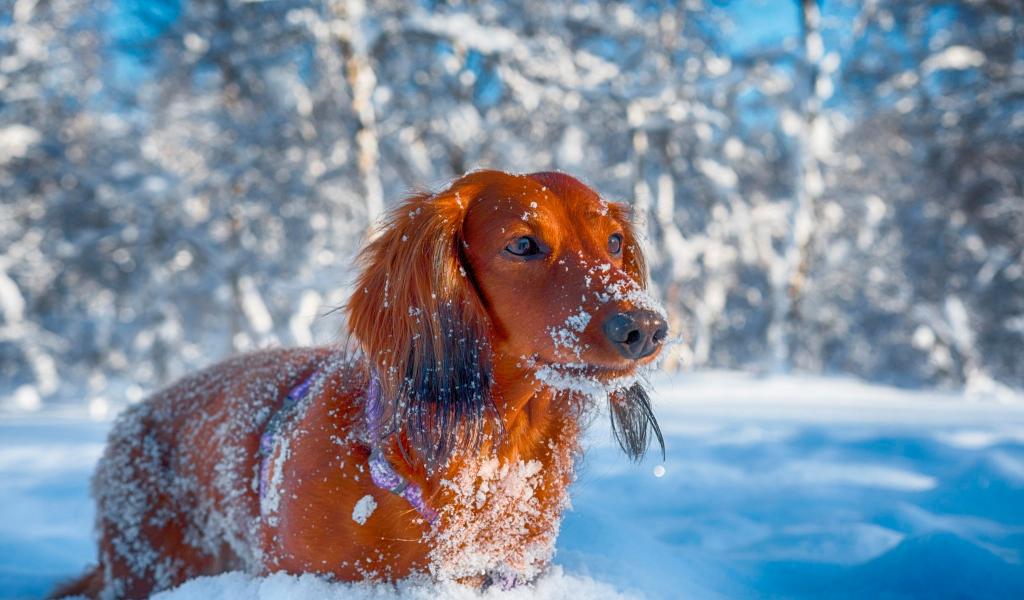 Wallpaper Red dachshund in the snow in the winter in the forest