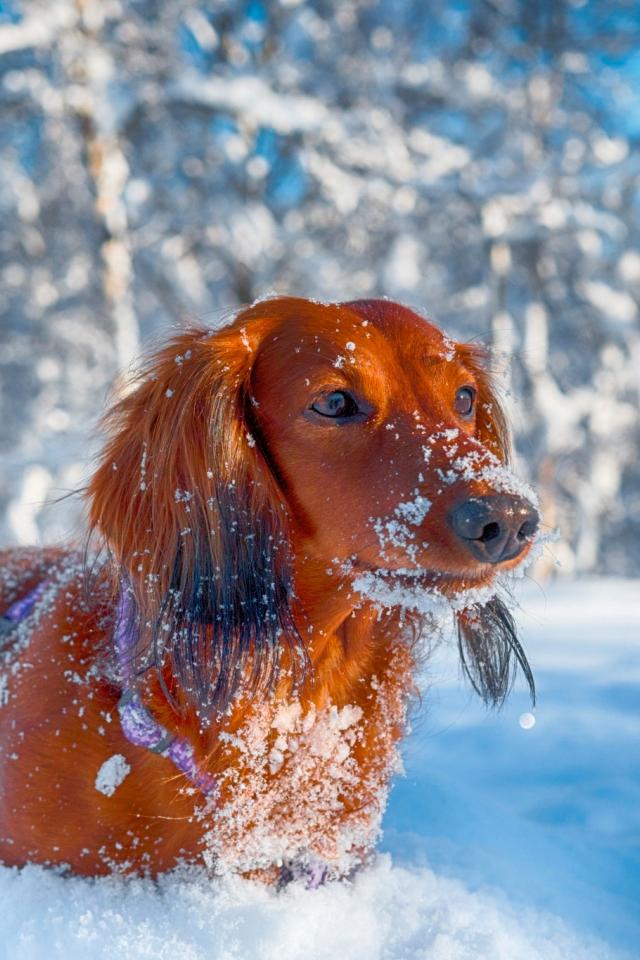 Wallpaper Red dachshund in the snow in the winter in the forest