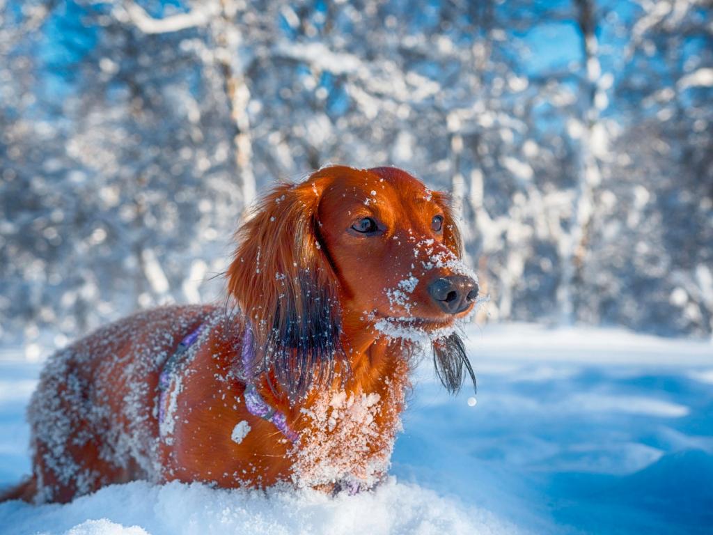 Wallpaper Red dachshund in the snow in the winter in the forest