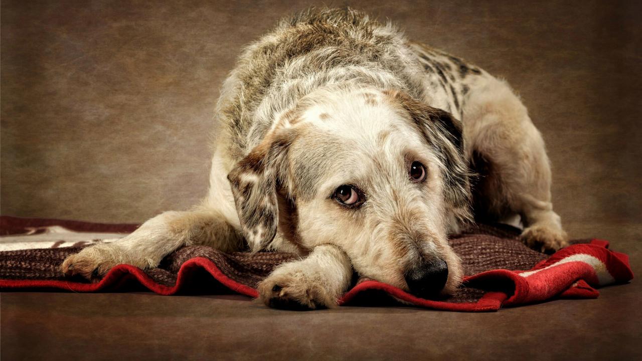 » Wallpaper Sad dog lies on the bedspread.
