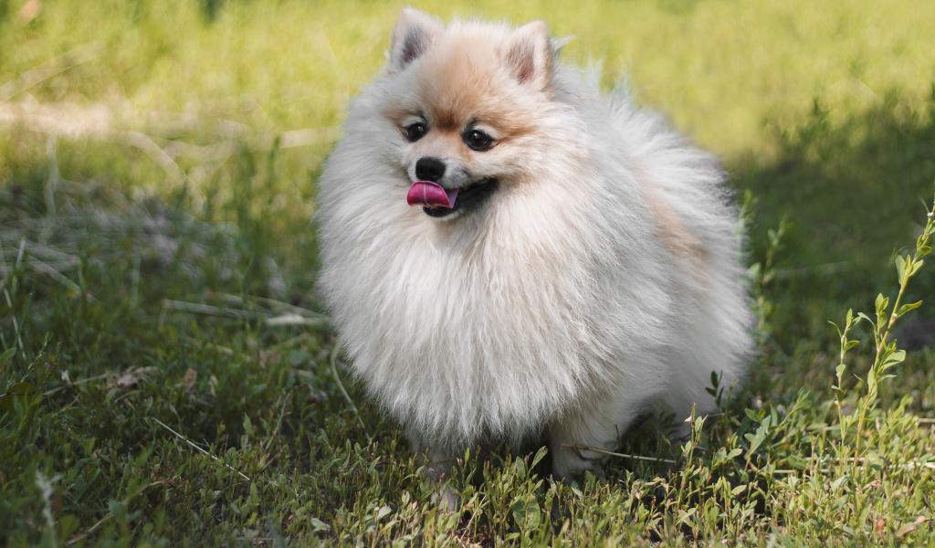 Wallpaper Fluffy Spitz with tongue hanging out on green grass