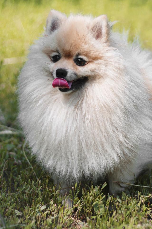 Wallpaper Fluffy Spitz with tongue hanging out on green grass
