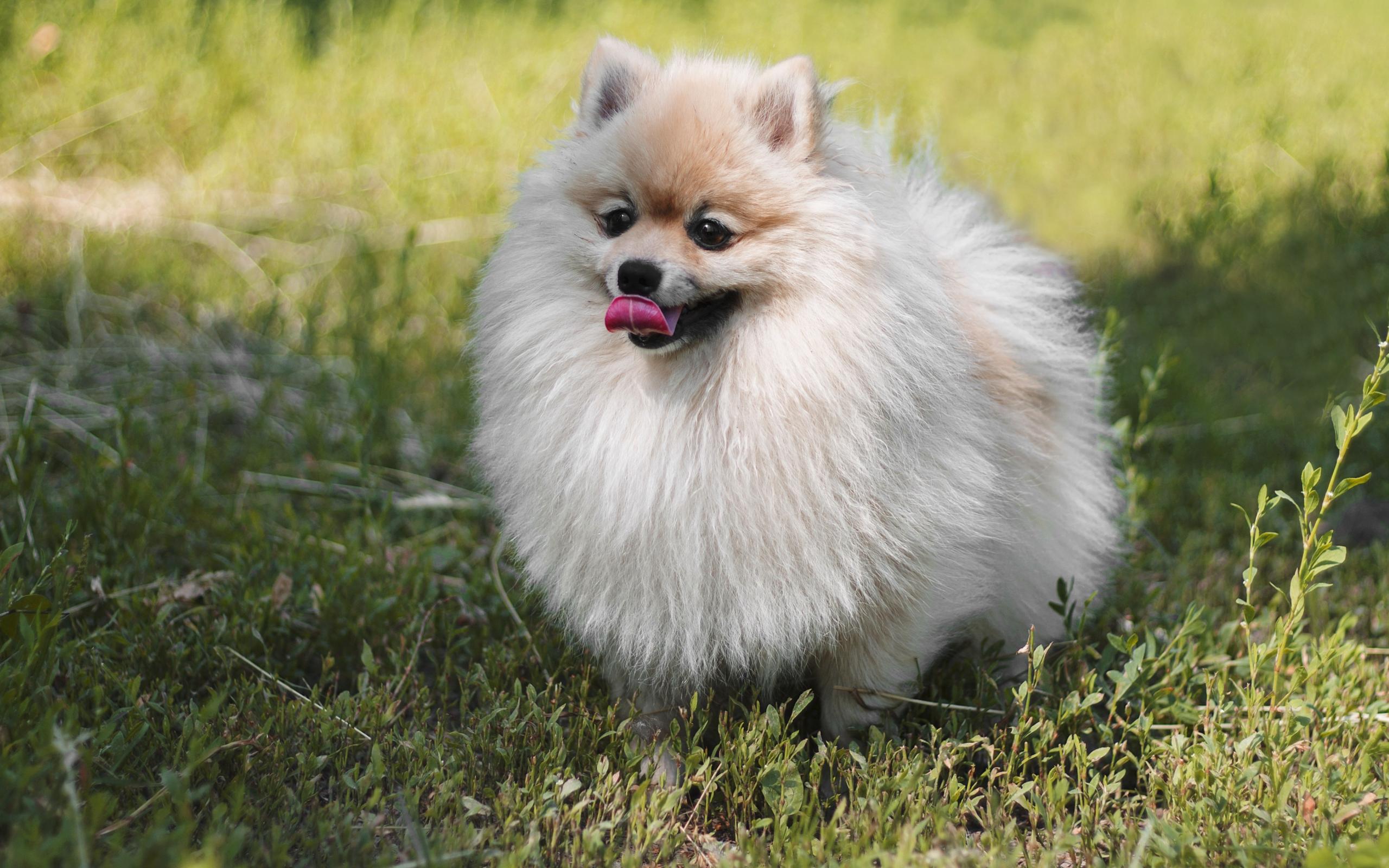 Wallpaper Fluffy Spitz with tongue hanging out on green grass
