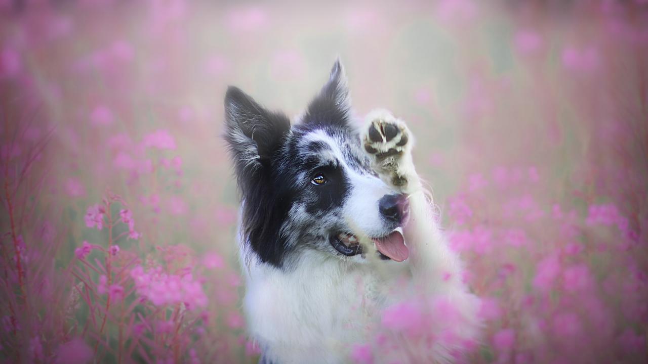 Wallpaper The dog breeds a border collie sitting in lilac flowers