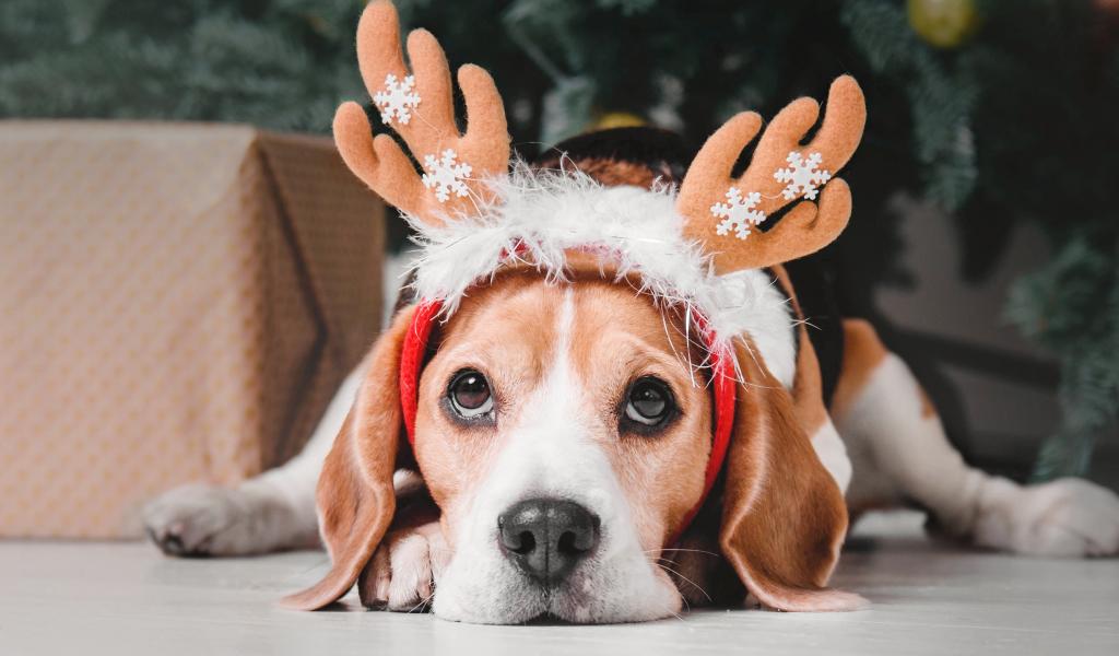 Wallpaper Beagle dog with deer horns under the Christmas tree