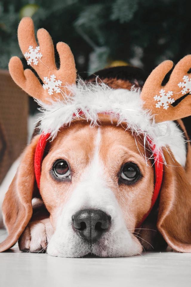 Wallpaper Beagle dog with deer horns under the Christmas tree