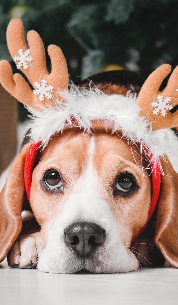 Wallpaper Beagle dog with deer horns under the Christmas tree