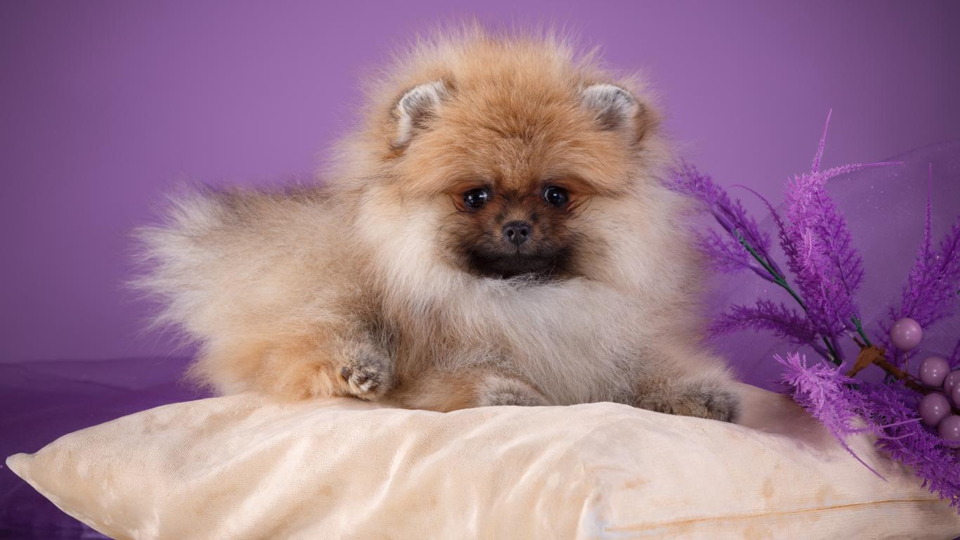Wallpaper Fluffy Spitz with tongue hanging out on green grass