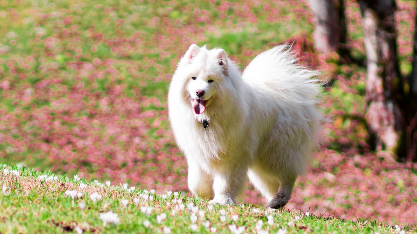 Wallpaper White Samoyed Dog with Tongue Hanging Out