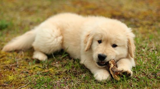 Wallpaper Golden retriever puppy nibbles a stick on the grass