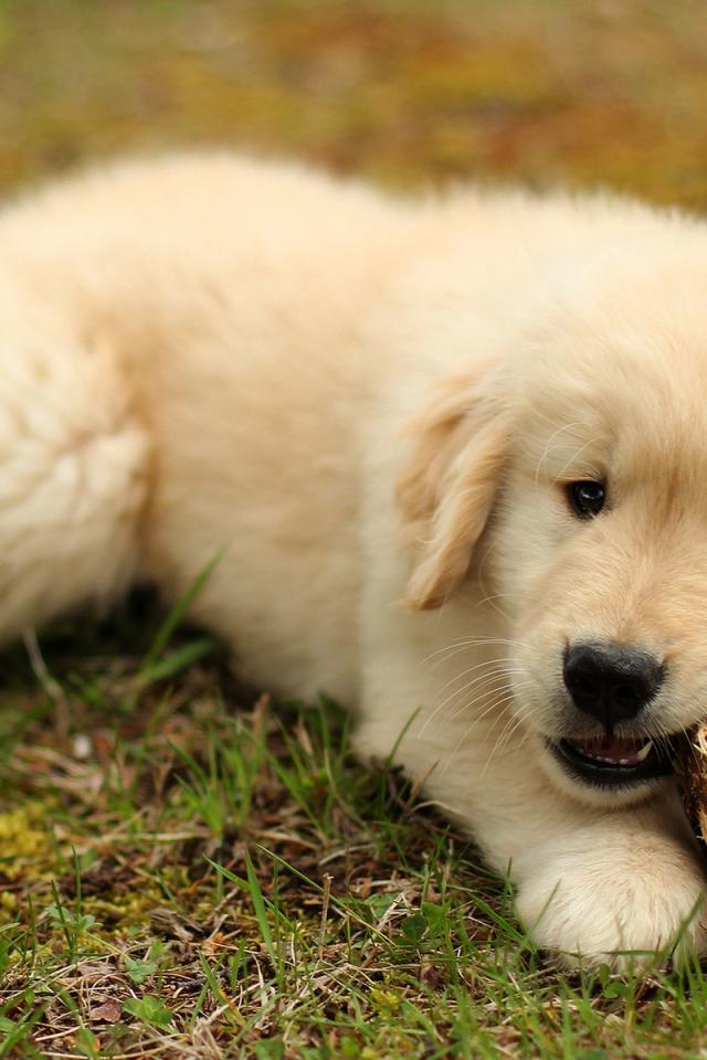 Wallpaper Golden retriever puppy nibbles a stick on the grass