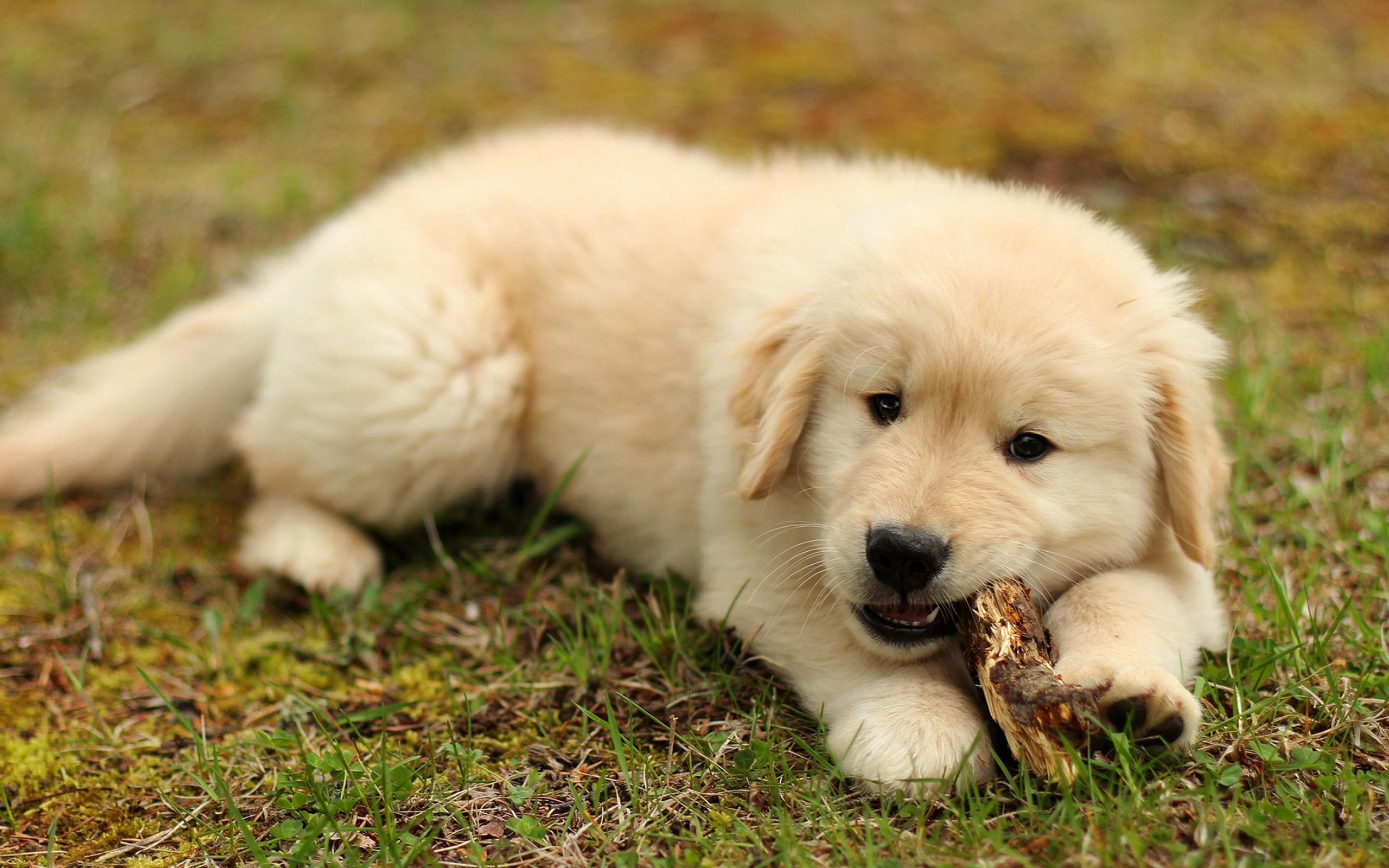 Wallpaper Golden retriever puppy nibbles a stick on the grass