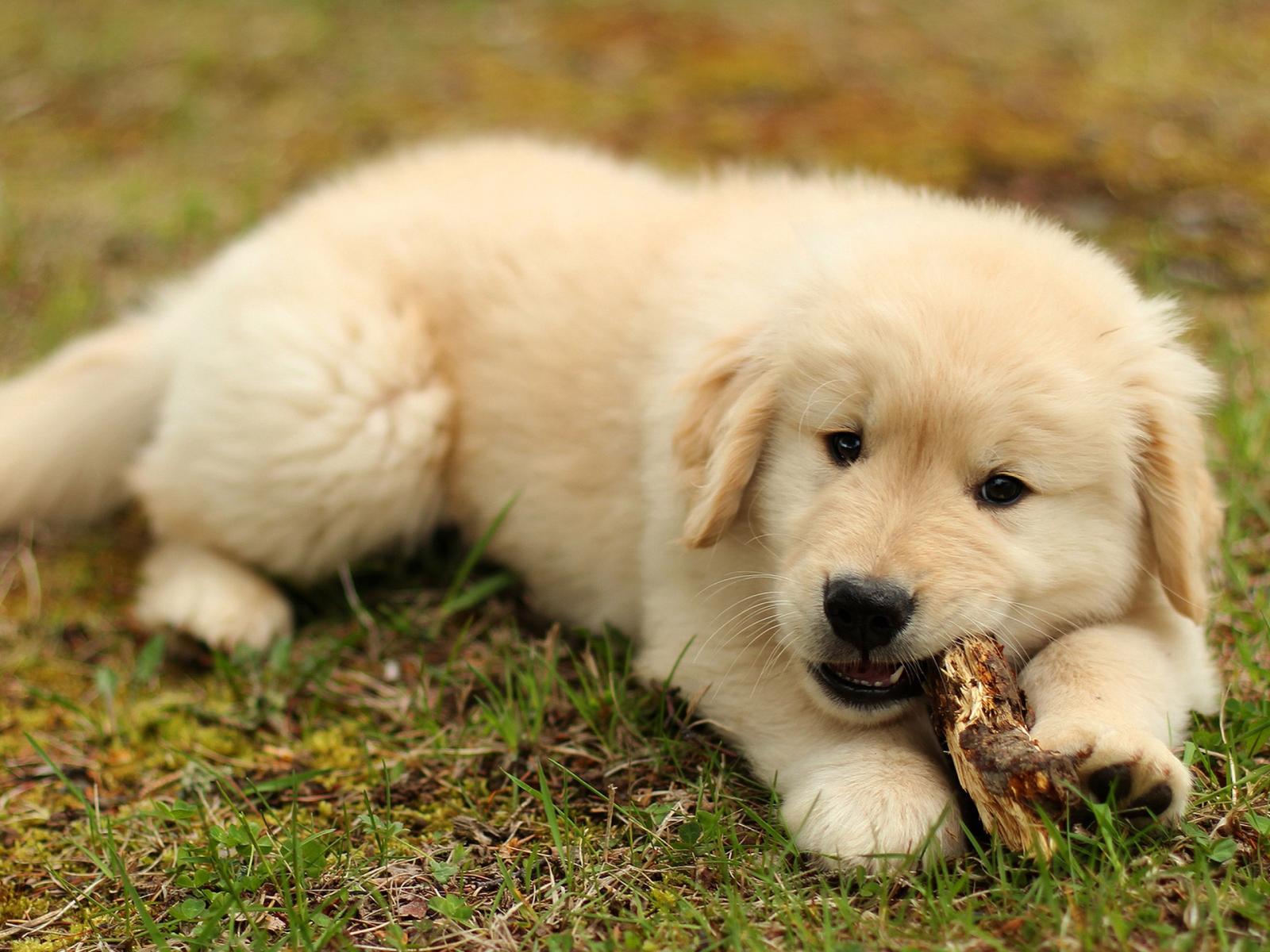 Wallpaper Golden retriever puppy nibbles a stick on the grass