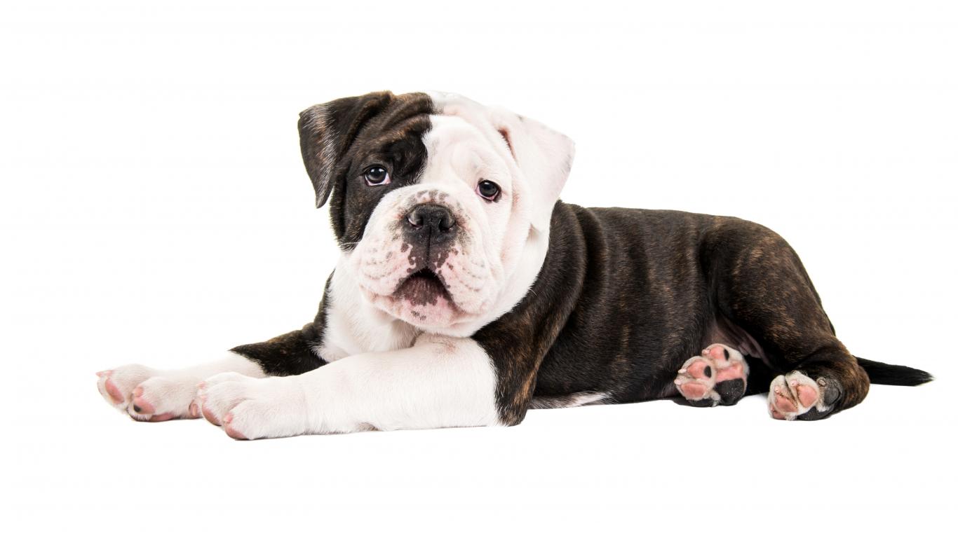 Wallpaper Little funny bulldog puppy on a white background