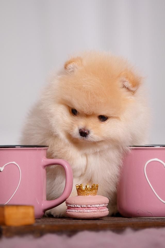 Wallpaper Cute pomeranian in basin with bath accessories on white background