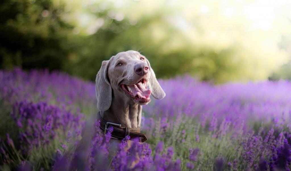 Wallpaper Weimaraner dog with tongue sticking out in flowers