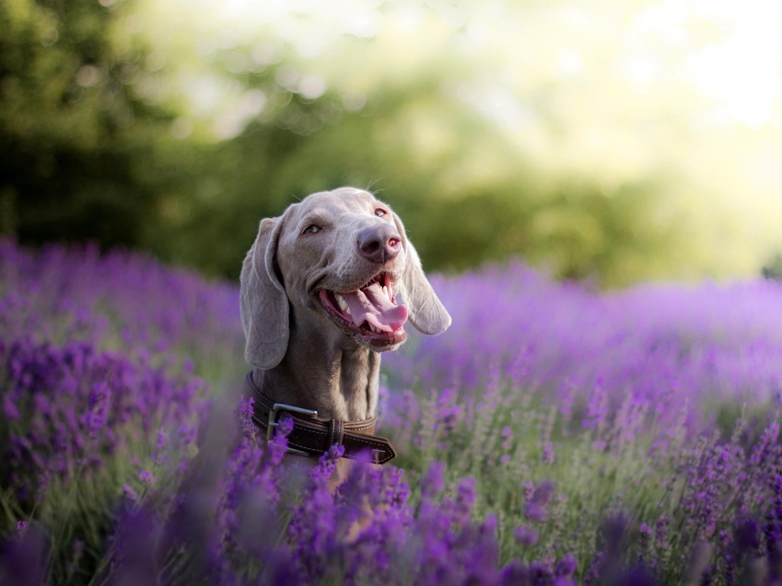 Wallpaper Weimaraner dog with tongue sticking out in flowers