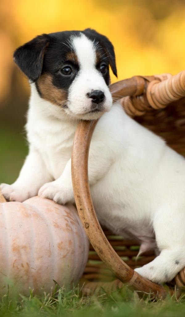 Wallpaper Little puppy sits in a basket on green grass with a pumpkin