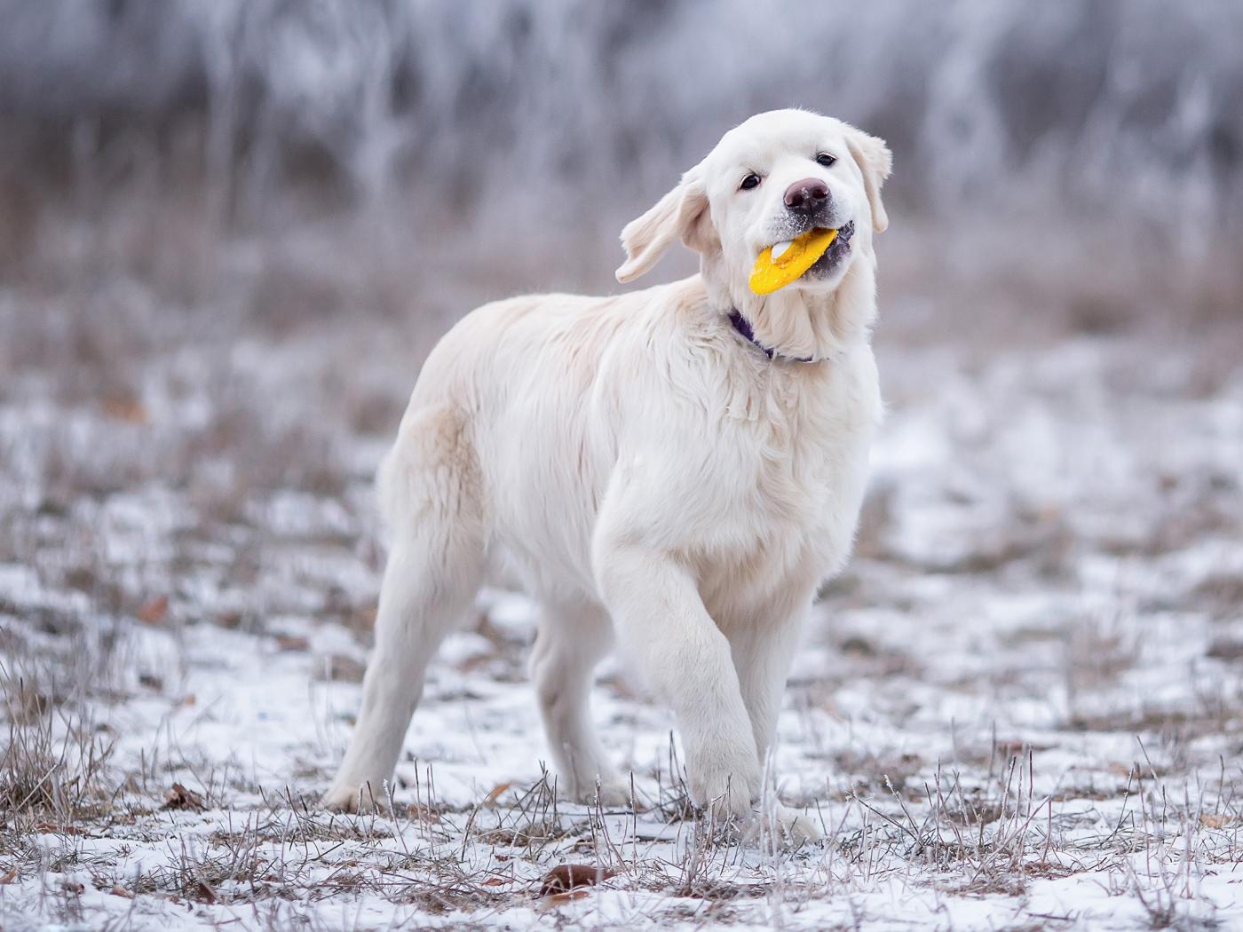 Wallpaper Golden retriever plays plays on the grass in winter