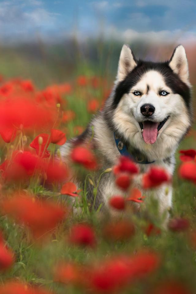 Wallpaper Husky with his tongue hanging out sits in poppy flowers.