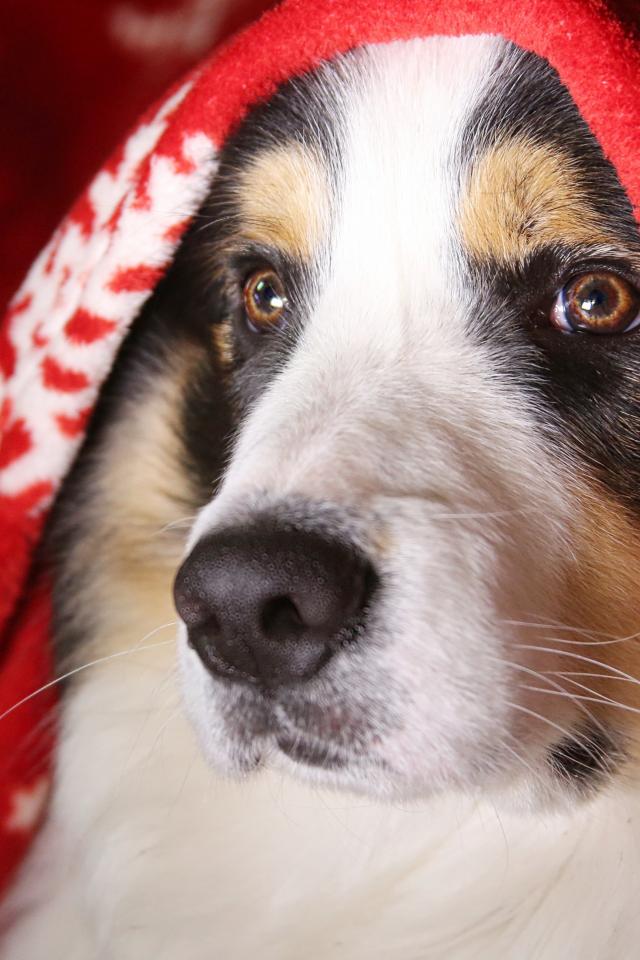Wallpaper Australian Shepherd Dog lies under a red veil with white hearts