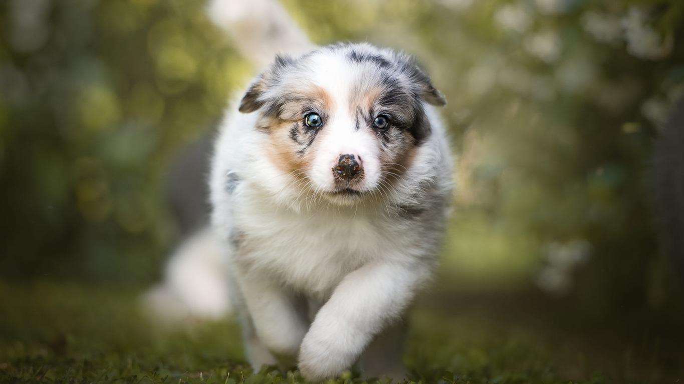 Wallpaper Australian shepherd puppy runs along the grass