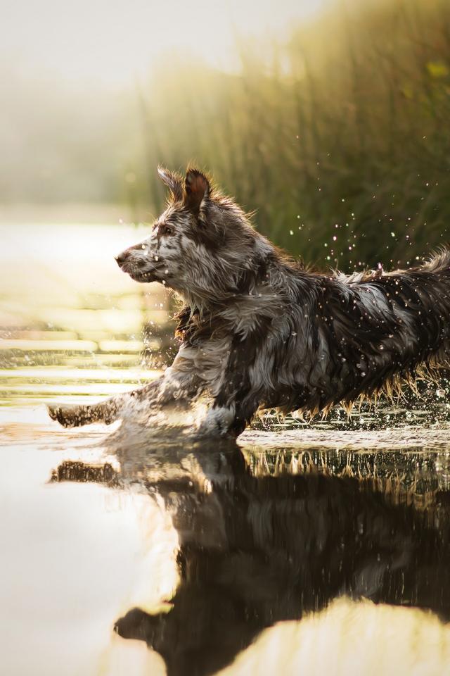Wallpaper A joyful dog runs on the water