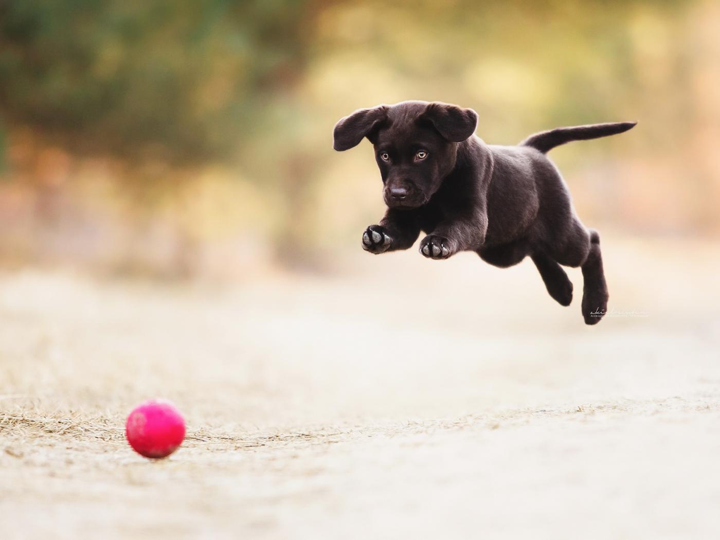 Wallpaper Black puppy is holding in his mouth deflated ball