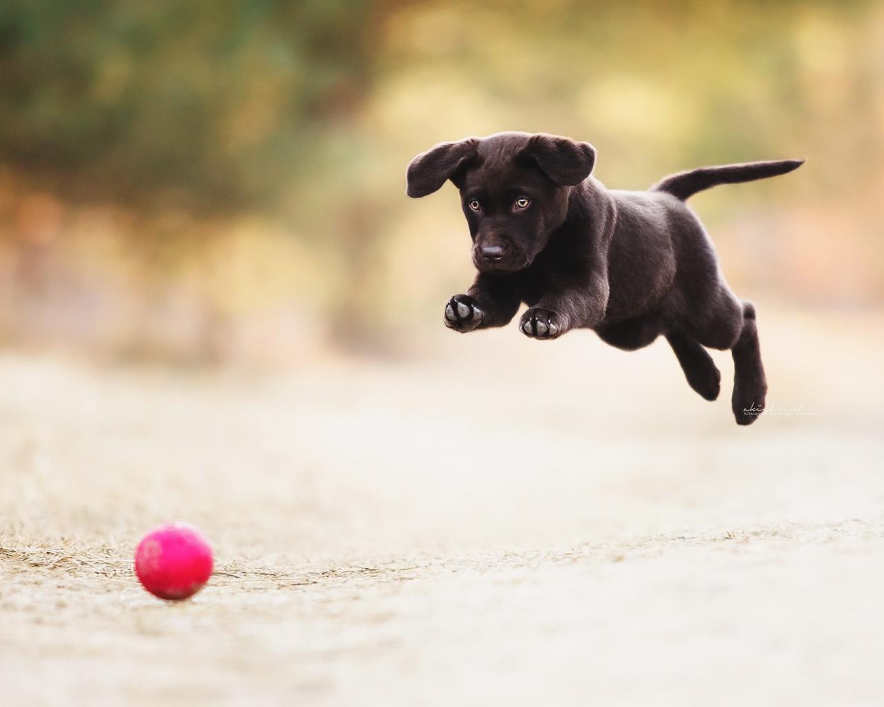 » Wallpaper Black funny puppy plays with a ball