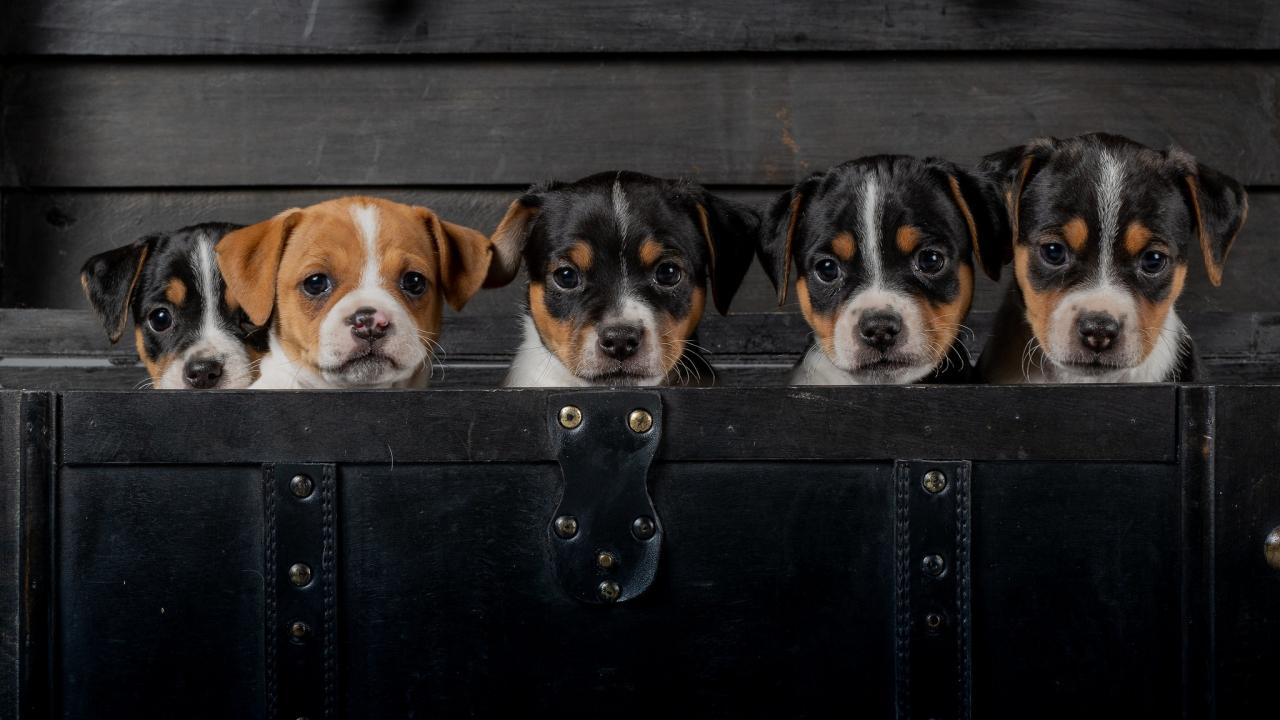 Wallpaper Little funny puppies are sitting in a black suitcase.