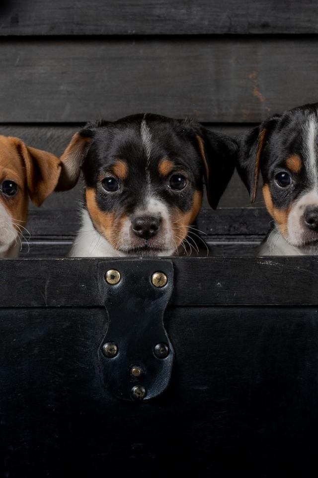 Wallpaper Little funny puppies are sitting in a black suitcase.