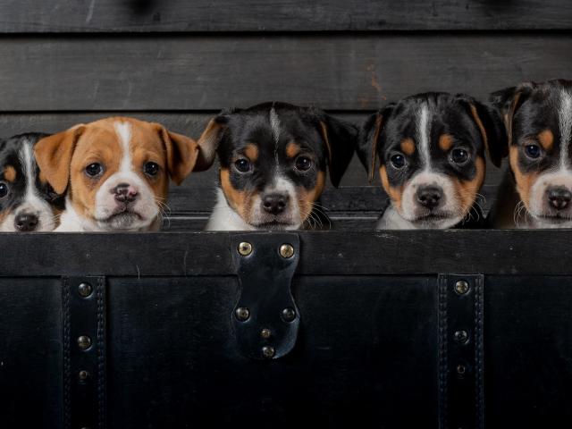 Wallpaper Little funny puppies are sitting in a black suitcase.